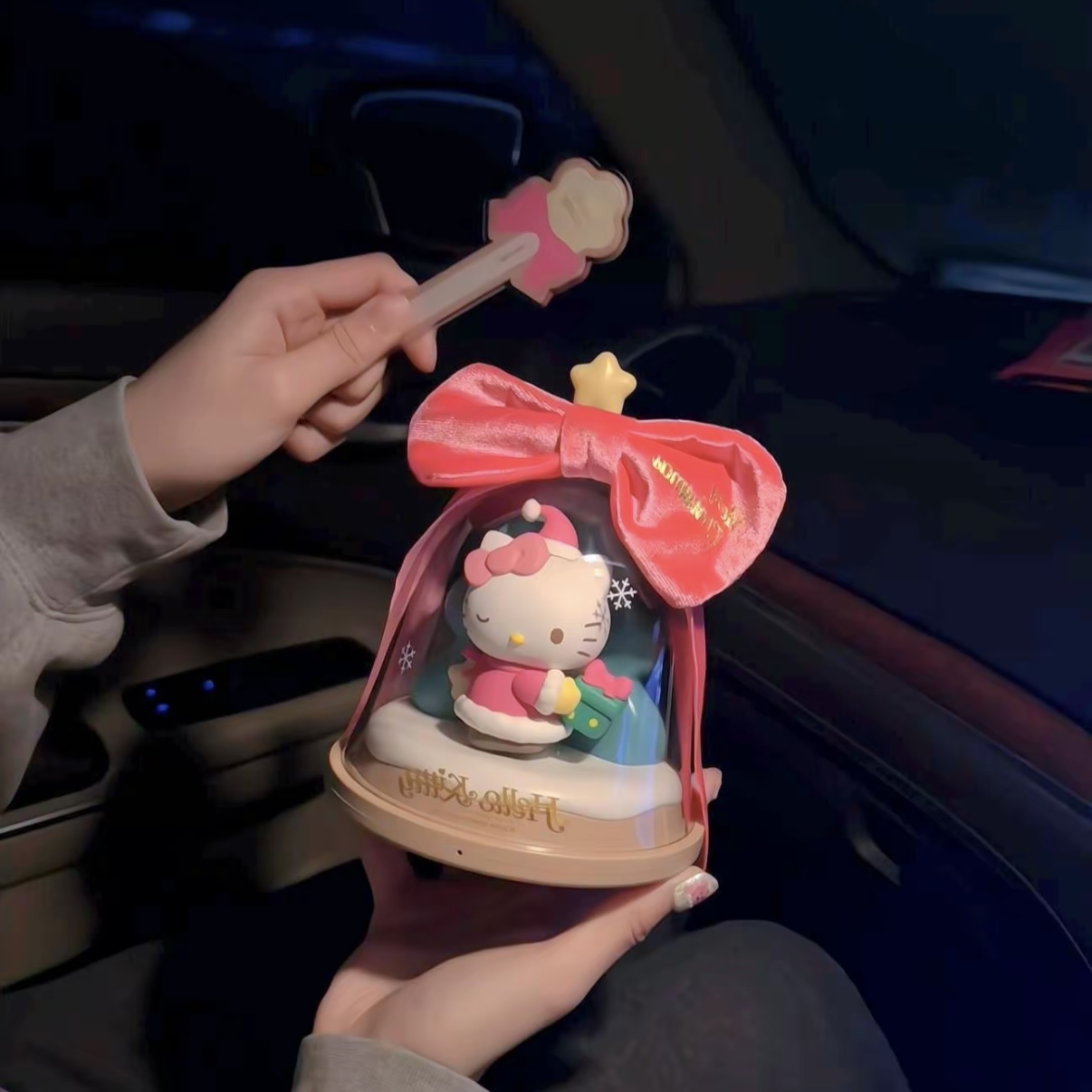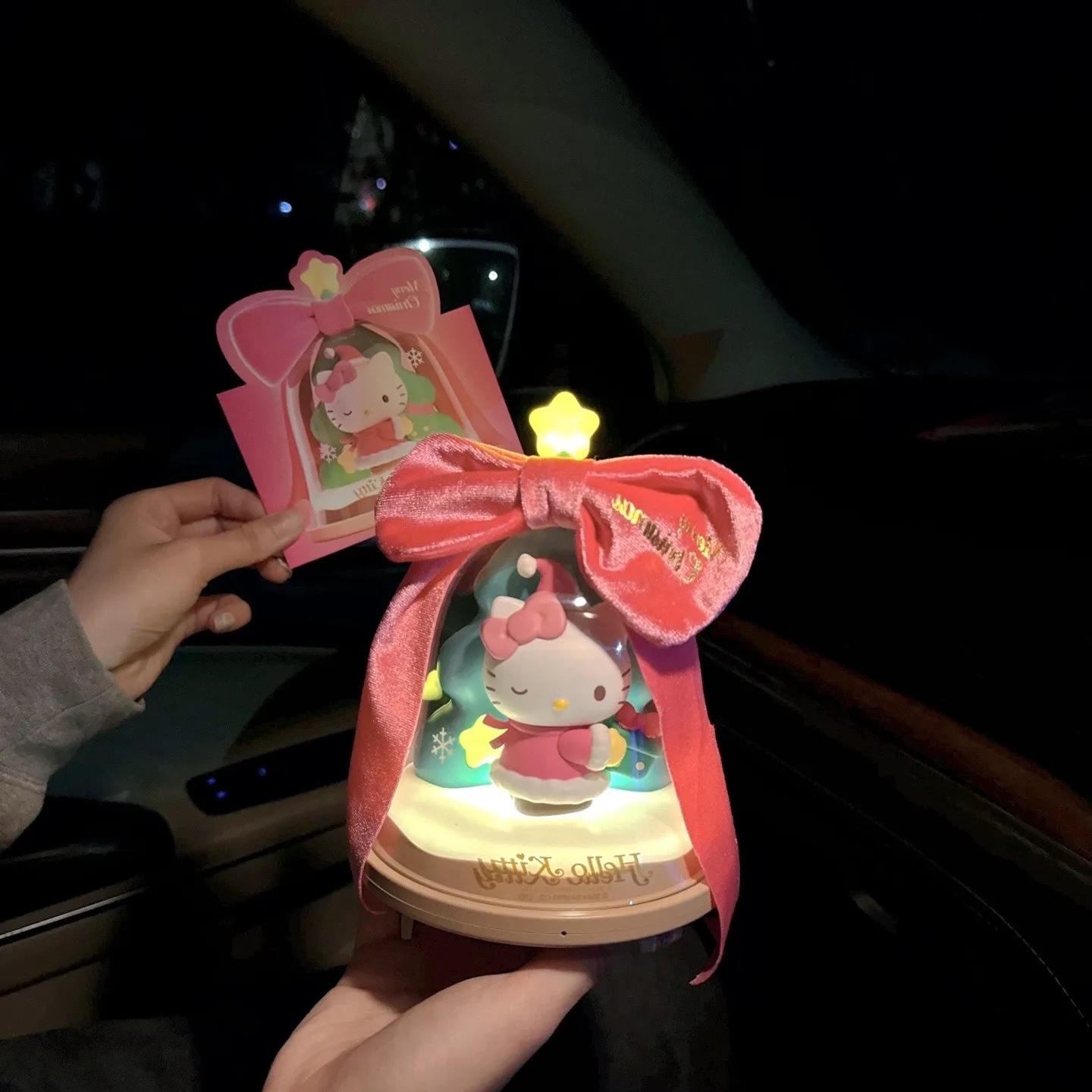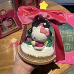 Adorable Design: Features Hello Kitty dressed in festive holiday attire under a translucent dome, topped with a glowing star and an elegant pink ribbon that says “Dreams Come True.”